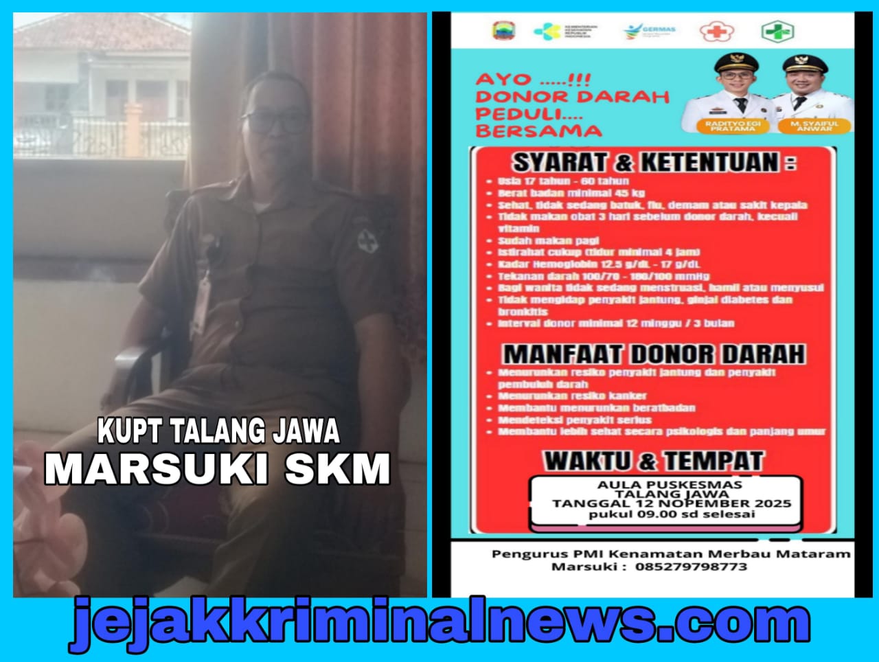 Jejakkriminalnews.com-KUPT puskes talang jawa Marsuki SKM mengajak masyarakat ikut donor darah di aula puskes,Jalan jalan batin putra no 45, dusun margajaya 1, Kelurahan talang jawa, Kecamatan Merbau Mataram Lampung selatan.