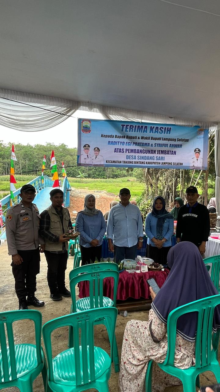 Tanjung Bintang – Pemerintah desa Sindang sari Kecamatan Tanjung Bintang menggelar kegiatan tasyakuran atas selesainya pembangunan Jembatan Kali Tempur yang berlokasi di Desa Sindang Sari, pada Sabtu, 10 Januari 2026. Kegiatan ini merupakan bentuk rasa syukur sekaligus ungkapan terima kasih kepada Pemerintah Kabupaten Lampung Selatan atas terealisasinya pembangunan jembatan tersebut.