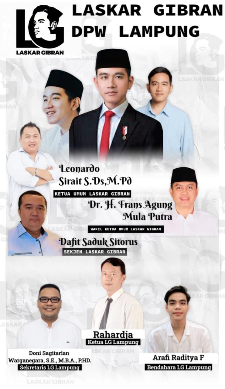 Dewan Pengurus Wilayah (DPW) Laskar Gibran Lampung menegaskan dukungan penuhnya terhadap setiap program yang digagas dan dilaksanakan oleh Laskar Gibran secara nasional maupun lokal. Dukungan ini merupakan bentuk komitmen untuk mewujudkan visi dan misi guna memberikan manfaat nyata bagi masyarakat Lampung dan Indonesia secara luas.
