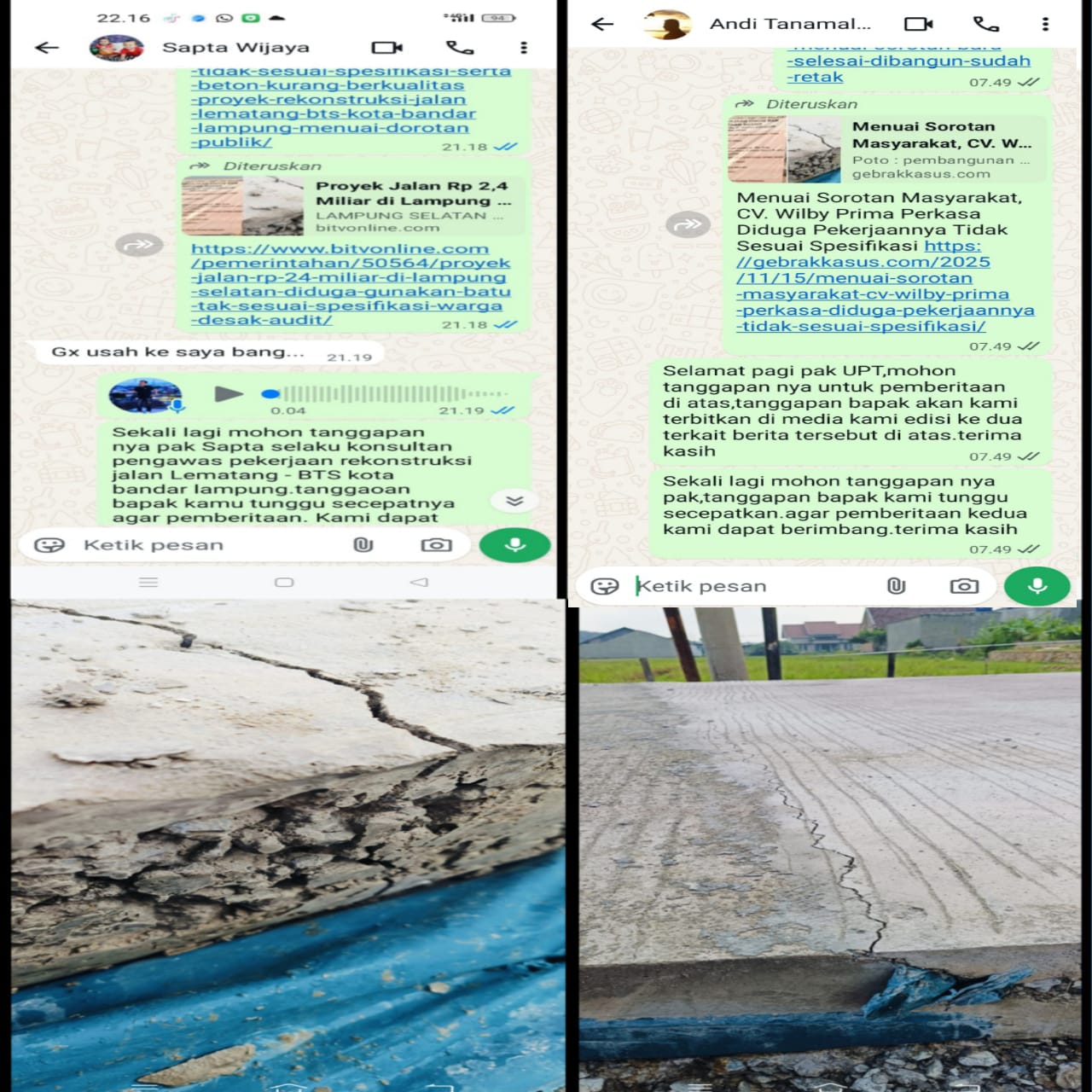 Di beritakan sebelumnya,-Proyek rekontruksi jalan Lematang-Batas kota Bandar lampung. yang berlokasi di Desa Sabah balau, Kecamatan Tanjung bintang Kabupaten Lampung selatan, menuai sorotan. Pasalnya belum lama selesai Dibangun, jalan rabat beton tersebut sudah mengalami keretakan dan patah.